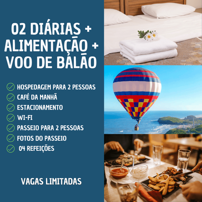 Experimente um refúgio romântico inesquecível com o pacote "2 Diárias e Voo de Balão em Torres". Ideal para casais, esta experiência completa inclui duas noites aconchegantes em um hotel encantador em Torres, onde você será recebido com um delicioso café da manhã todas as manhãs. Desfrute do conforto e da hospitalidade deste destino mágico, perfeito para criar memórias inesquecíveis com a pessoa amada.